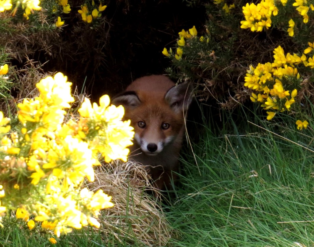 Foxes Vulpes vulpes give birth between January and late April, mostly, with a peak in March. According to the literature (for example national-fox-welfare.com and wildlifeonline.me.uk), their gestation is only 52 days—short compared with the cat’s (about 63 days). Mother foxes dig out and furnish an earth well before the cubs are born, and they will stay in there with their litter for about the first twelve days. The newborn cubs must be kept warm, and suckled, during this blind-deaf-and-fuzzy stage; the male brings food for the vixen, and there may be some non-breeding female helpers too. At three weeks, the cubs are ready to emerge and play-fight near the entrance to the earth. This is when you may hear them and watch their play. Apparently it’s also the first time their father sees them.